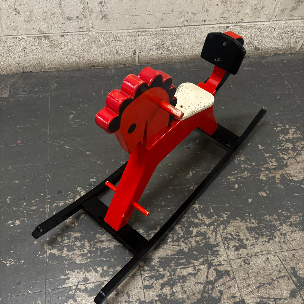 Description wooden horse, distressed, red and black
